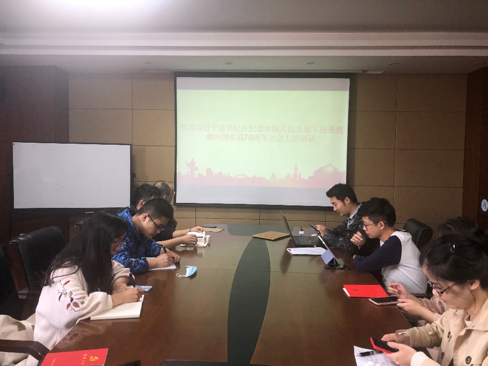 党支部成员集体学习了习近平总书记在纪念中国人民志愿军抗美援朝出国作战70周年大会上的讲话。周洋同志分享了学习心得,现阶段中美贸易战的激战正酣,为了保障国家和人民的利益,我们要发挥伟大抗美援朝精神,要敢于斗争、不怕牺牲。张哲益同志做了总结发言,他指出现阶段我们处于科研一线,需要在科研岗位上努力奋斗,发扬伟大抗美援朝精神,做出自身应有的贡献。