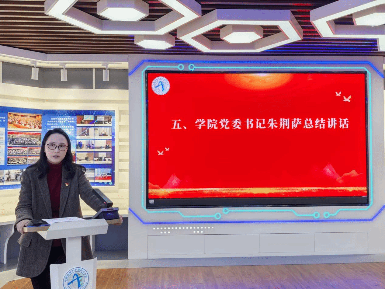 学院党委书记朱荆萨作总结讲话并讲授专题党课。她指出党建工作是凝聚人心的工作,要继续弘扬“支部建在连上”光荣传统,全面提升党支部组织力、凝聚力和战斗力。她强调,各党支部书记要继续对照“七个有力”建设要求,着力打造思想过硬、温暖人心、战斗力强的党支部。一是提升思想修养,筑牢信仰根基。学生党员要始终把握好政治性和先进性的关系,增强理论素养和政治自觉性,坚持真学真信真用、学懂弄通做实,让党的创新理论入脑入心,用党的创新理论凝心铸魂。二是提升业务能力,锤炼过硬本领。学生党支部书记要树牢党员身份意识,自觉修专业、修德行、修党性,以身作则,严于律己,全方位提高履职能力和业务素质,增强自身影响力和感召力,更好将先锋模范作用发挥在平常,用实际行动诠释使命与担当。三是提升组织效能,凝练支部特色。学生支部建设要紧扣高校党建“双创”工作责任目标,将规范性和特色化有效衔接,挖掘特色亮点,创新工作方式,聚力培育更多融汇“新工科”特色的“五型”党支部,促进支部建设与学生成长同向同行,合力推动学院事业向上、向好、向前发展。