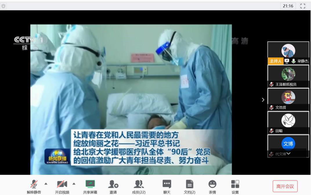 3月24日10:00,231174班团支部通过线上会议(腾讯会议)召开了“学总书记讲话,话青春担当”的主题团日活动,由团支书姜昱主持进行,许彦老师受邀参加。
