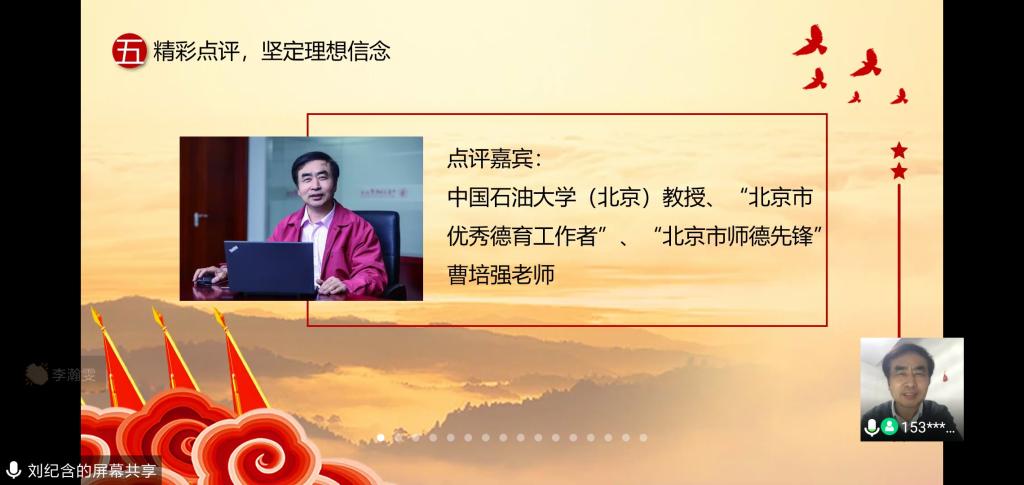 听完同学们和疫情一线工作者的分享后,中国石油大学(北京)马克思主义学院曹培强教授对本次班会做出点评。曹培强教授说:“这是一场特殊的班会,特殊的时刻、特殊的形式、特殊的内容、特殊的群体。人来到世界上有三个母亲:养育自己的妈妈、培养自己的母校与自己的祖国母亲。在这场疫情中,祖国母亲遇到了困难,千万个母亲送出孩子,参与到这场重大的疫情阻击战中。龚姣姣书记和肖纬琦同学母女齐上阵、共抗疫,在平凡的岗位上做出了不平凡的事情。王晖同志一直坚守在疫情防控一线,让我看到了共产党员的初心和使命,看到了共产党员不畏艰难,冲锋在前。爱国是具体的、深沉的、多样的。对比中外应对疫情采取的不同态度和措施,我们看到了中国特色社会主义制度优势。”疫情防控期间众多的抗疫故事让他感动不已,大道之行,天下为公。青年大学生经过这次疫情的历练,将能够承担起民族复兴的大任,在新的挑战面前,毫不畏缩,负重前行!