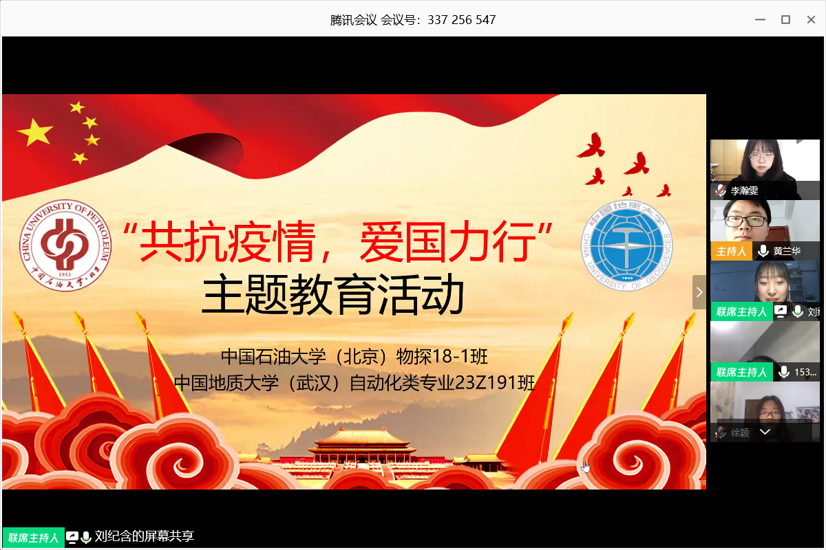 (武汉)自动化类专业23Z191班与中国石油大学(北京)物探18-1班“云”牵手,联合开展以“共抗疫情、爱国力行”为主题的线上班会。本次班会邀请的嘉宾有中国石油大学(北京)马克思主义学院曹培强教授,武汉市江岸区公安分局劳动街派出所所长王晖,武汉市蔡甸区蔡甸街正街社区党委副书记龚姣姣。本次班会坚定了青年学生“四个自信”,激励学生在新时代大力弘扬爱国主义精神,为实现中华民族的伟大复兴而不懈奋斗。