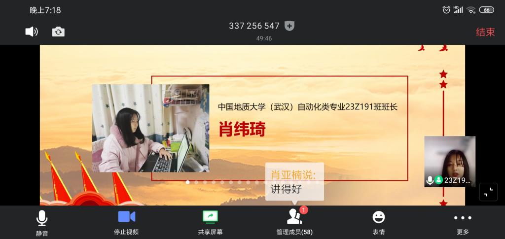 (武汉)自动化专业23Z191班尤际尧同学和中国石油大学(北京)物探18-1班徐雨寒同学尤际尧同学谈了学习体会。徐雨寒同学谈到,一是要抓好每天的学习,不能落下任何一门功课,做到“停课不停学,成长不延期”,做到自律、自护、不扎堆、少聚会;二是要自觉将个人梦想融入中国梦,坚定理想信念,矢志艰苦奋斗,为实现中国梦贡献青春力量。尤际尧同学说:“两周前的思政大课给我留下了深刻的印象,在疫情面前我看到了共产党员冲锋在前,勇于担当的精神,我看到了医护人员逆行的身影,我看到了一方有难、八方支援的责任担当,这一幕幕都让我感动不已。作为当代大学生,我们应该与祖国同呼吸共命运,在祖国需要的时候挺身而出,全力以赴地投入到工作学习之中,以青春之我创青春之国家。”