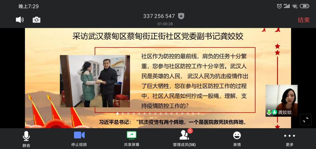 武汉市蔡甸区蔡甸街正街社区党委副书记龚姣姣同志为同学们讲述社区疫情防控工作。龚书记首先介绍了社区的疫情防控情况,她通过一些时间点和一些具体事例让我们直观地了解社区作为疫情防控的第一道防线,在病毒阻隔和生活保障各个方面所做的工作。在工作中,她们按照习总书记“始终把人民群众生命安全和身体健康放在第一位”的要求,两个月来连续奋战,哪怕是面对感染的风险也始终坚守岗位。龚书记用工作数据告诉我们,“以当时的疫情发展状况,如果不是封城、四类人员集中收治、小区封闭式管理这些正确的决定,疫情的防控和阻断在这个千万人口的大城市是难以实现的”,这也让我们感受到国家决策的正确和及时。最后,龚书记站在一个母亲、一个家长的角度上给同学们分享了一些小的体会,一是希望同学们面对疫情能有正确的判断力和自我保护能力,二是通过疫情思考体会每个人的责任和担当,三是力所能及的情况下参与到志愿服务中去。同时,希望同学们通过这次疫情都能有警醒、有反思、更有成长。