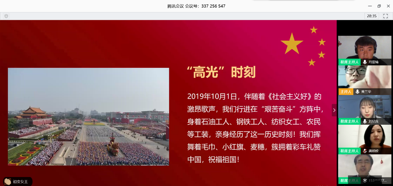 中国石油大学(北京)物探18-1班韩己航同学分享了自己参加庆祝新中国成立70周年群众游行的经历。韩己航同学谈到,同学们在训练中不怕苦、不怕累,对于步幅、步速、排面精益求精,为了确保关键时刻万无一失。在讲到走过天安门广场的经历时,他说:“看见习总书记向我们招手的那一刻,我们的爱国热情一下子就迸发出来了,虽然已经过去半年,现在回想起来,我的内心依然十分激动,参加群众游行是我有生以来最为荣耀的时刻!”在“艰苦奋斗”彩车前,他们学习铁人精神,并庄严宣誓“矢志艰苦奋斗,争做新时代追梦人”,他们相信新时代依然是属于奋斗者的时代。