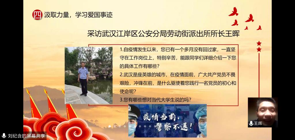 武汉市江岸区公安分局劳动街派出所所长王晖同志就自身负责的具体工作给同学们做了分享。王晖同志谈到,武汉市市委以及武汉市新冠肺炎防控指挥部位于本辖区内,一方面要做好辖区居民的安全稳定工作,另一方面要做好政府机关部门安全保障的工作。从1月23日凌晨五点他们就进入战时状态,执行武汉封城的紧急任务,至今已有一个多月没有回家了,所有的民警都在超负荷工作。王晖同志说:“作为一名共产党员,作为一名人民警察,守护人民群众的生命安全则无旁贷,要把党和人民的利益放在第一位,在危难时刻更应该坚守岗位,冲锋在前,用实际行动践行共产党员的初心和使命。”最后,他对当代大学生寄语期望,要树立远大理想,练就过硬专业本领,肩负当代青年的责任,不辜负这个伟大的时代。