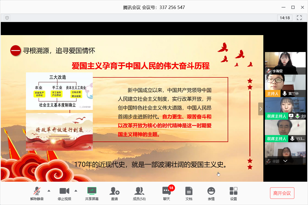中国石油大学(北京)物探18-1班团支书刘纪含同学带领同学们通过朗诵古代爱国诗词,使同学们深刻认识到爱国主义植根于中华民族深厚的传统文化中,爱国文化传统体现在强烈的忧患意识中,爱国文化传统体现在强烈的报国意识中。通过回溯近现代以来中国人民在中国共产党的领导下从“站起来”到“富起来”再到“强起来”艰苦历程,使同学们深刻认识到爱国主义孕育于中国人民的伟大奋斗历程中。在不同的历史时期,具有鲜明时代特色的爱国主义精神都得到了充分彰显。