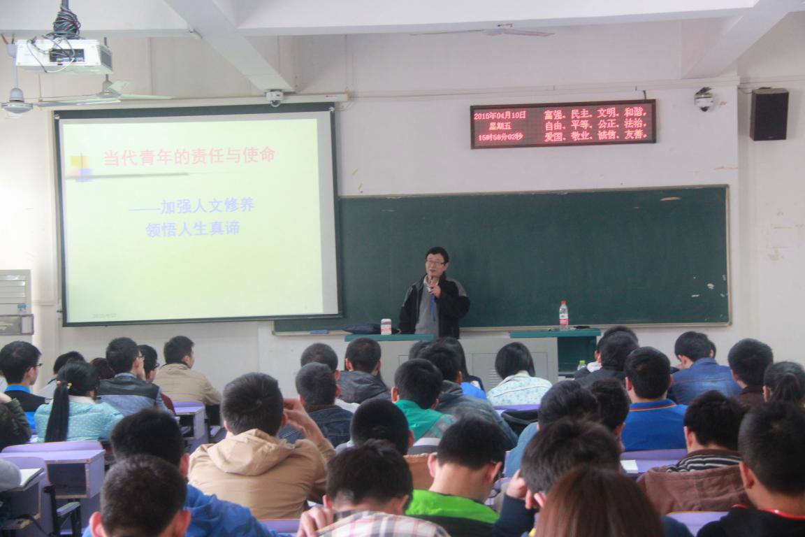 刘老师从党员数量减少和党员的先锋模范作用引入,从四个方面阐述了当代青年的责任与使命。首先刘老师讲述了什么是责任,指出责任的内涵在于它是一种态度,体现一个人的心态、原则、作风和习惯;它是一种境界,体现了一个人的使命、胸怀、理想和追求;它更是一种价值取向,体现了一个的人生观、价值观和世界观。其次刘老师通过讲述当今社会责任缺失的现象引发同学们的思考,刘老师引用温总理在2011年4月14日的讲话——“诚信的缺失、道德的滑坡已经到了何等严重的地步”——说明当今社会令人堪忧的道德现状,并以北师大董藩和小悦悦事件加以佐证。最后刘老师指出当代青年的使命,鼓励大家要有自己的生命追求,恪守君子之道,做一个高尚的人、做一个努力学习的人、做一个践行大学之道的人、做一个充满文化修养的人,从而在有限的生命中去创造无限的价值。