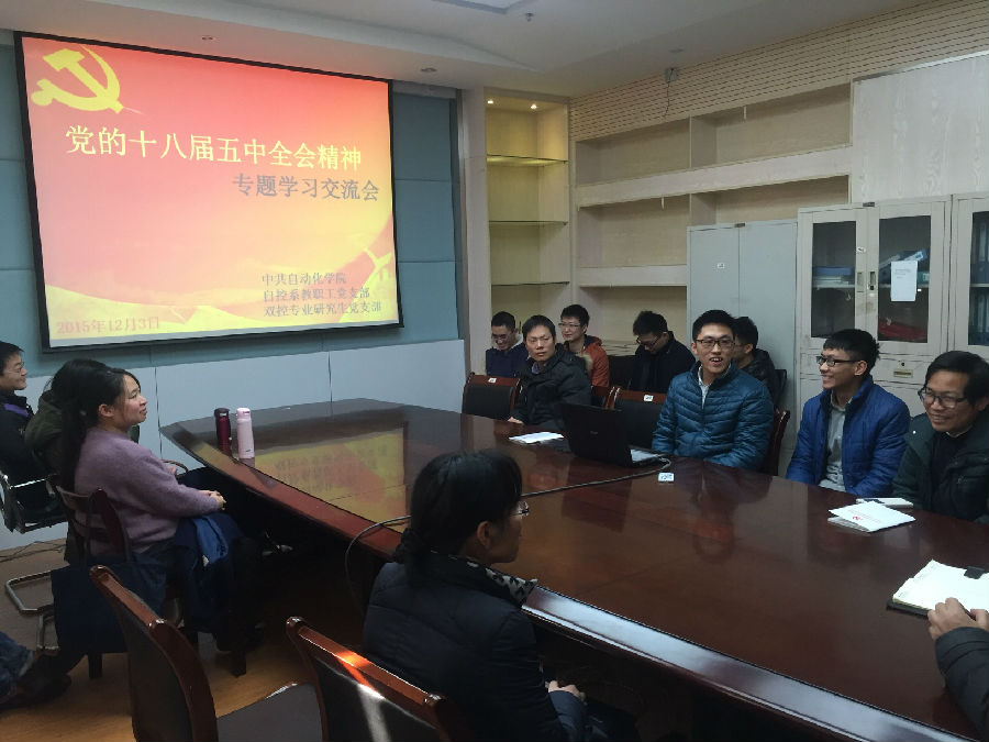 (通讯员  刘亚锋)12月3日下午,海角视频 自控系教职工党支部与控制科学与工程专业硕士研究生党支部在教二楼615会议室召开“党的十八届五中全会精神专题学习交流会”。会议由自控系教职工党支部书记吴涛老师与研究生党支部书记刘亚锋共同主持,两个支部所有党员参加了会议。
