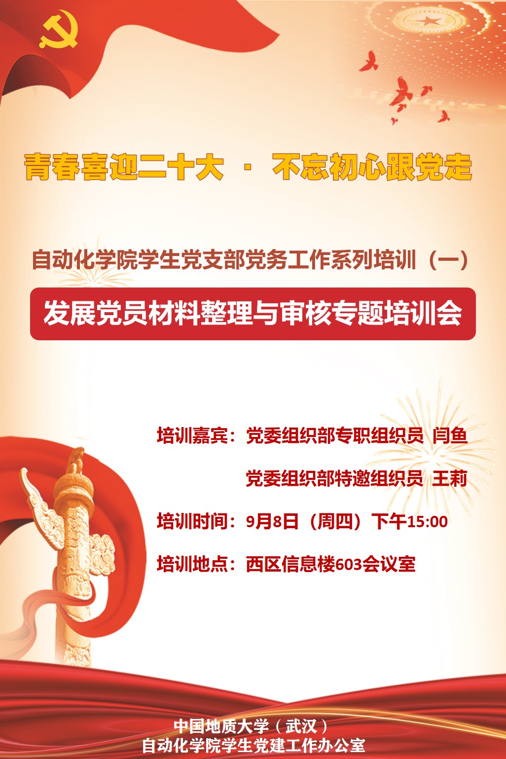通讯员:黄兰华、陈文虎、李兵权)为进一步规范发展党员流程,提升党员发展质量和水平。9月8日,海角视频 在信息楼603会议室开展了学生党支部党务工作专题培训的第一期——《发展党员材料整理与审核专题》,学院学生党建工作办公室特别邀请党委组织部专职组织员闫鱼老师、党委组织部特邀组织员王莉老师莅临现场指导,学院全体学生党支部支委参加本次专题培训。专题培训会由学院学生党建工作办公室主任黄兰华老师主持。