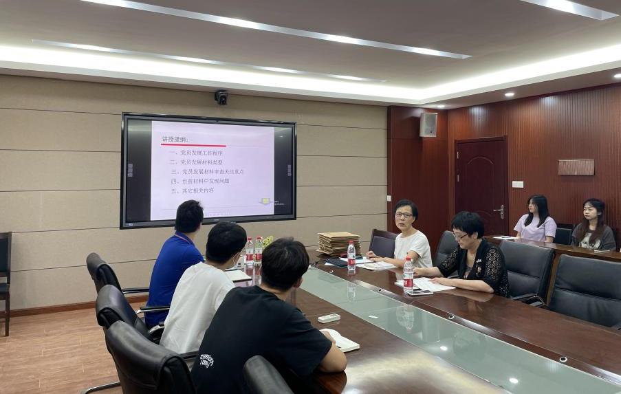 校党委组织部特邀组织员王莉老师就发展党员材料整理与审核的重要性方面着重谈到,一是要认识到发展党员材料审核是一项严肃的政治任务,严格党员发展过程既是对党组织负责也是对发展党员的政治生命负责;二是要注重发展过程的规范性和时间的逻辑性,确保材料内容正确规范;三是希望每位支委应深入了解党员发展过程中自身职责,并认真履行职责。最后,她希望各支部支委和即将接受党组织谈话的发展对象能够熟读、牢记党章,并严格按照党章规定落实党员发展流程。