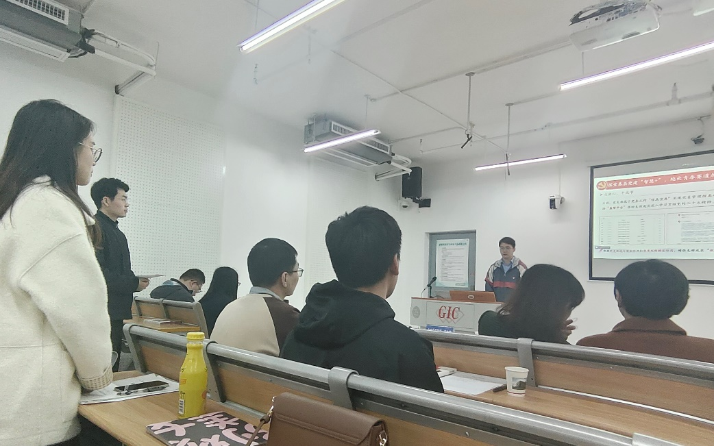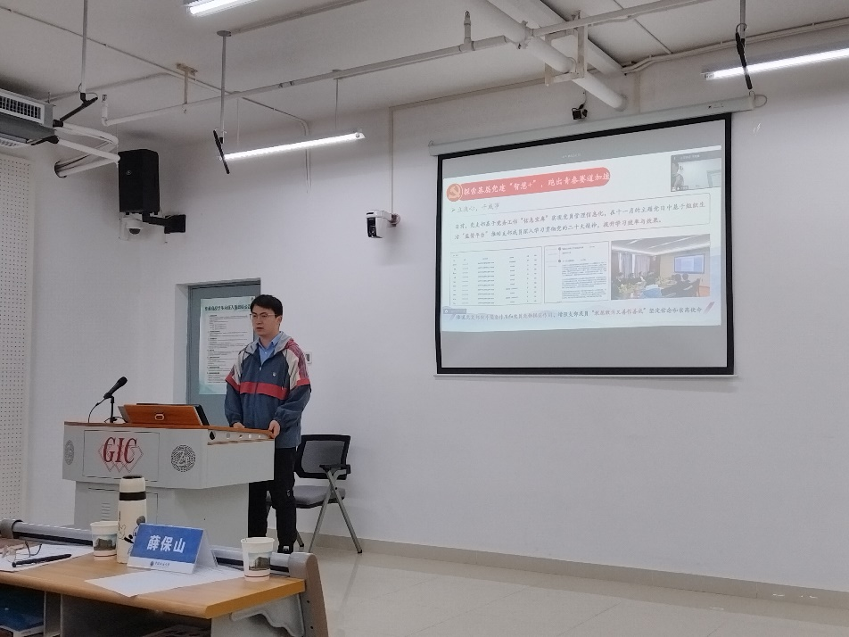 博一党支部书记陈文虎以《融汇‘新工科’专业特色,让支部建设走‘新’更走‘心’》为题,从夯基础、强组织,创特色、树品牌,谋发展、求突破三个方面分享了支部在建设过程中的创新与突破、经验与成就,呈现了以“创新型和工程应用型的国家化高层次人才”培养目标、以“新工科”为专业特色、以“党建+新一代信息技术”为工作品牌的支部样貌,总结介绍了打造“引领型、学习型、服务型”党支部的具体举措。