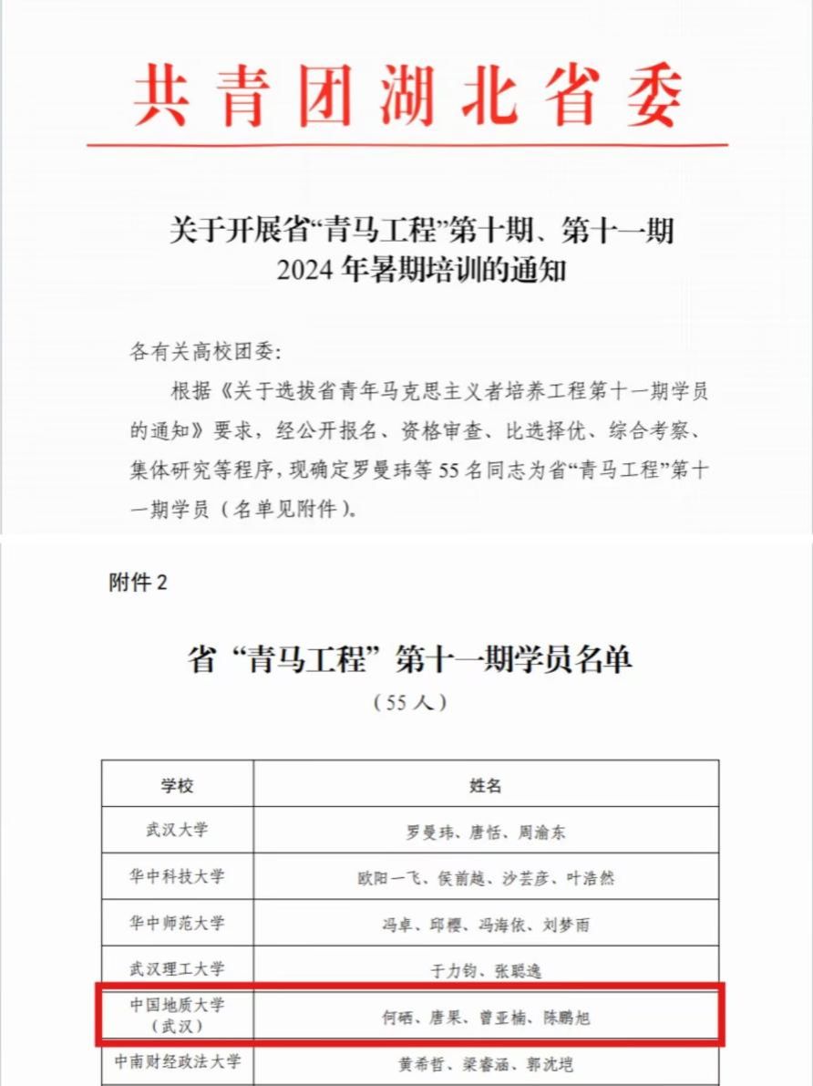 今年5月,共青团湖北省委、湖北省教育厅联合发布《关于选拔省青年马克思主义者培养工程第十一期学员的通知》,从湖北省20所高校中遴选55名大学生作为省“青马工程”第十一期学员。经公开报名、资格审查、比选择优、综合考察、集体研究等程序,海角视频 2022级自动化专业本科生陈鹏旭同学成功入选!