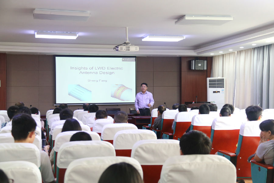 方胜博士的学术报告题为“随钻电阻率仪器天线的设计原理和改进”。他针对原有环状天线设计的原理和存在的问题,通过大量实验仿真数据,详细介绍了将 U型槽运用在“slim Antenna”中的研究过程,实现“slim Antenna”小尺寸、可拆卸等目标,在实际应用中达到成本控制和效能方面大幅度提升。