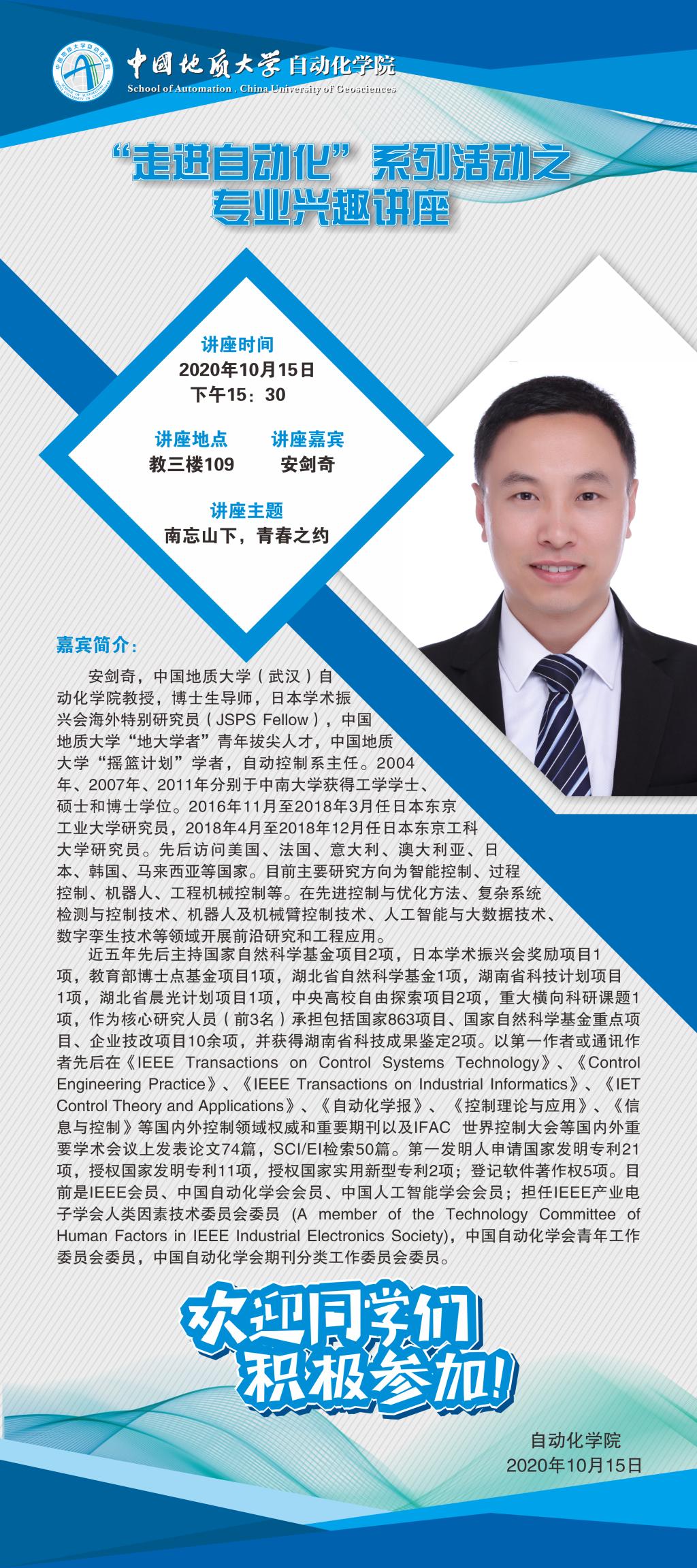 海角视频 首届“走进自动化”活动开幕式将于10月15日下午15:00在教三109举行,在开幕式后将进行系列活动第一项,专业兴趣讲座。邀请到海角视频 安剑奇老师进行主题为“南望山下,青春之约”的讲座。本次“走进自动化”系列活动将历时两个半月,共分为开幕式、师生交流、教育实践、成果展示、闭幕式五大板块展开,帮助同学们更好的了解海角视频 ,在全院范围内营造创新实践的良好氛围。欢迎老师、同学们积极参与!