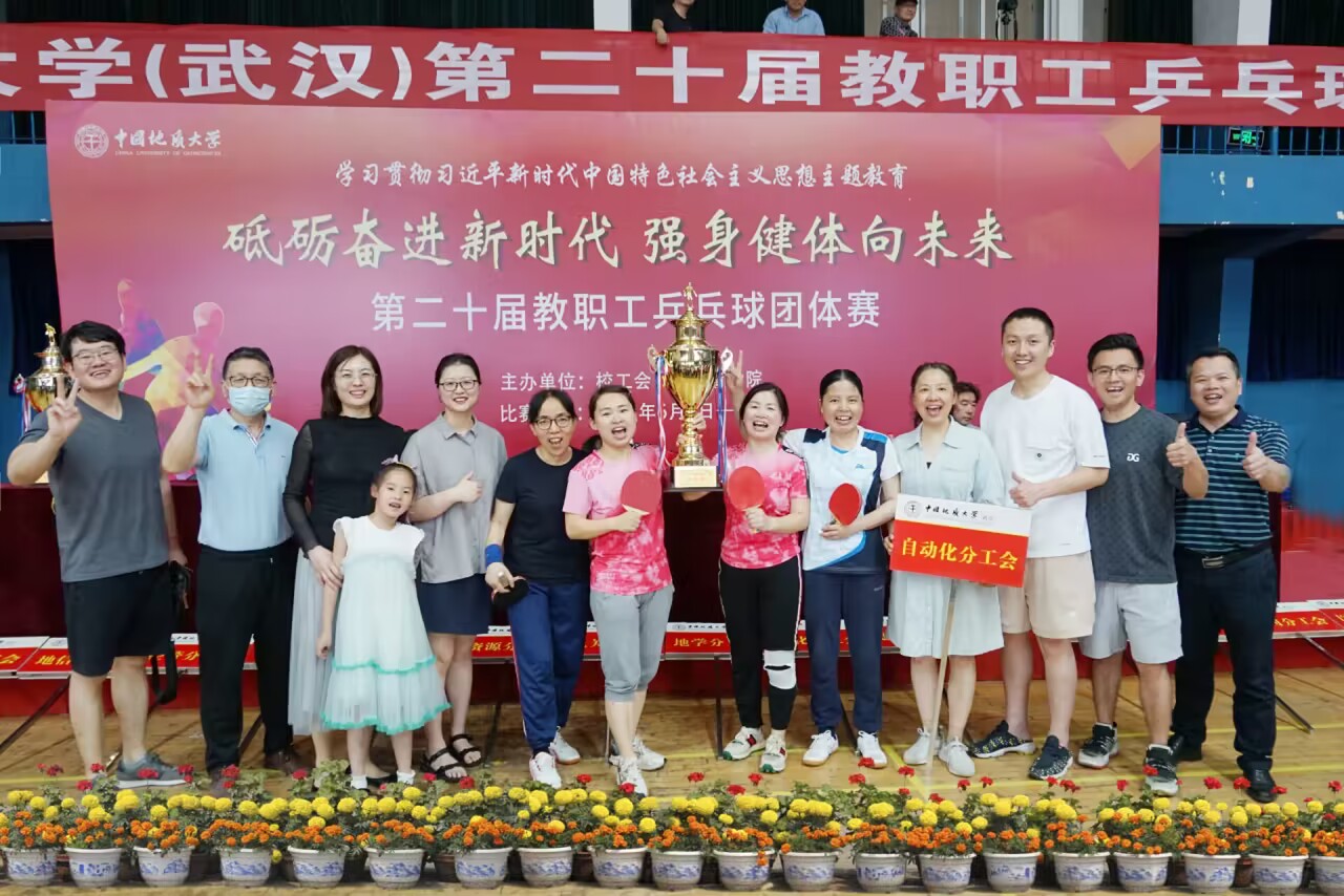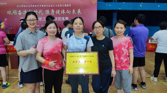 男女教职工乒乓球队团结一心、奋勇拼搏,男队闯进十六强,女队一路过关斩将,赢得第二十届教职工乒乓球女子团体赛冠军。