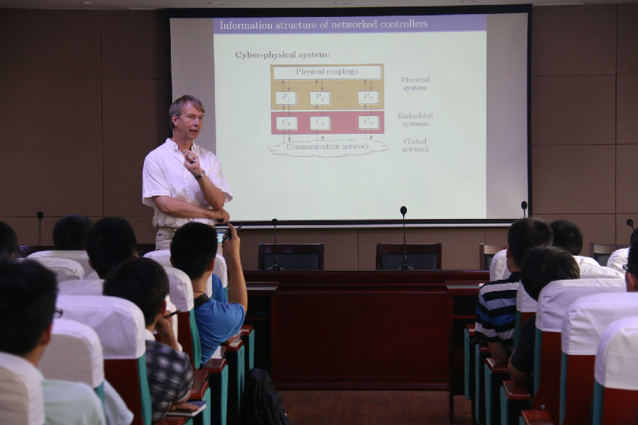 Jan Lunze教授的学术报告题为“Self-organising control of autonomous agents”。他结合自身多年的研究,介绍了自组织控制方法研究的思路、解决的问题及其在机器人控制中的应用。