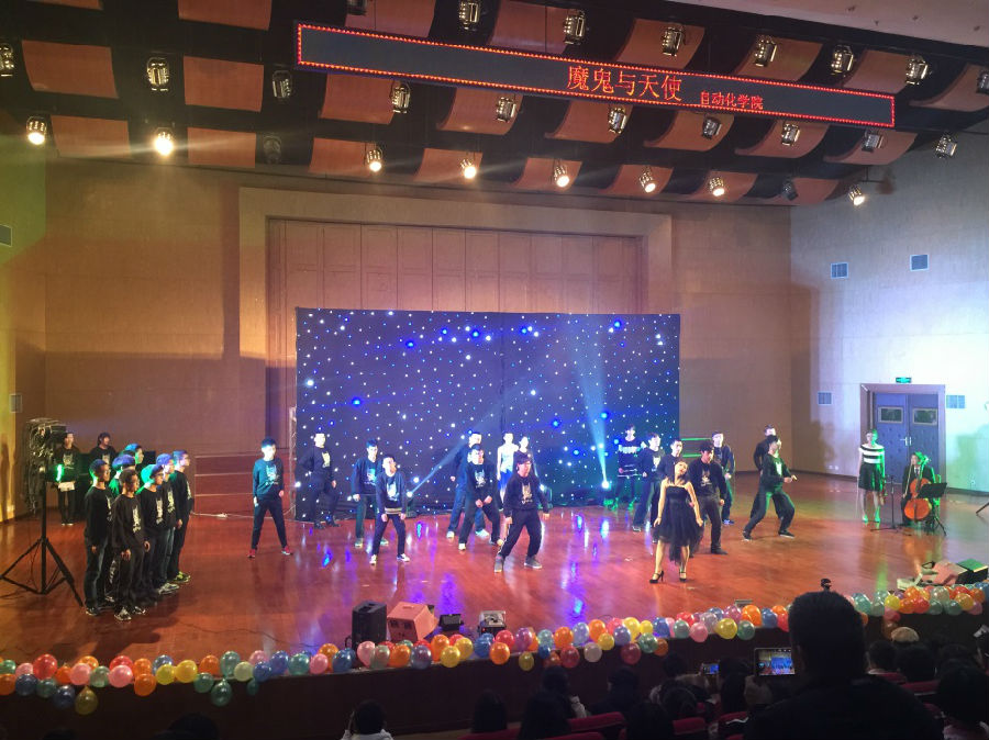 海角视频 231152班歌舞节目《魔鬼与天使》以男女主角的爱恋为背景,伴随大提琴、小提琴和舞蹈,并融入具有海角视频 特色的机械舞,给现场观众留下了深刻印象。据悉,此次SuperClass比赛共计12个学院参赛,各学院选拔一支队伍参加决赛,评委由专业老师和学生代表担任。