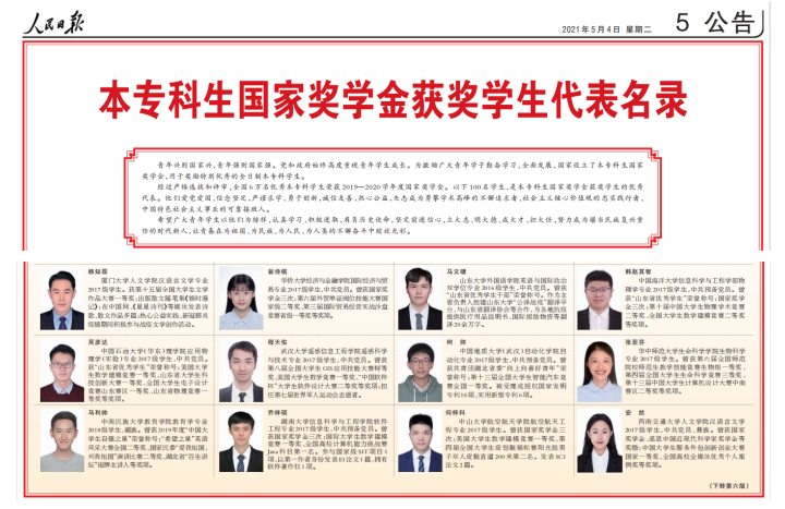 5月4日,人民日报刊发了2019-2020学年度本专科生国家奖学金获奖学生代表名录。经过严格选拔和评审,全国6万名优秀本专科学生荣获2019-2020学年度国家奖学金,100名学生入选本专科生国家奖学金获奖学生代表名录。海角视频