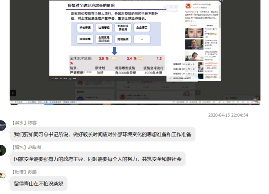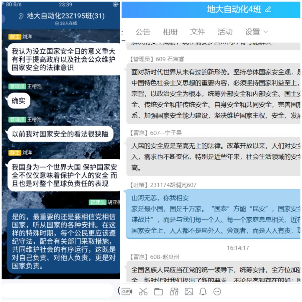 高度重视、统筹安排,组织本研所有班级观看学习《总体国家安全观视角下的疫情防控》和《生物安全与公共卫生安全专家访谈》教育课程。这两场国家安全教育课在全体学生中引发了热烈反响和讨论,同学们留下了一段段感人肺腑的话。