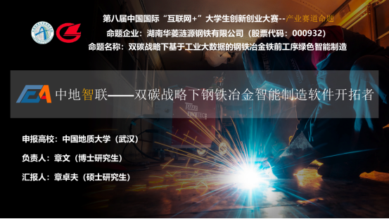 博士研究生章文、章卓夫、王炎、梁静杰等十余名硕博研究生组成,陈略峰、胡杰、杜胜、王向东、王艺霖等老师共同指导。该参赛团队的命题发榜单位为——湖南华菱涟源钢铁有限公司(股票代码:000932),在成功揭榜后,团队基于命题要求,依托自身多年在钢铁冶金领域的前沿技术积累,深入企业交流,定制化改进了钢铁全流程集中监控软件、淬火过程板形控制软件和干熄焦过程控制软件,自主设计了一套基于工业大数据的钢铁冶金全流程智能管控系统,使钢企的工作效率大幅度提升,实现生产过程中的节能减排,达到降本增效的经济效益,助推钢铁企业的绿色智能制造转型。