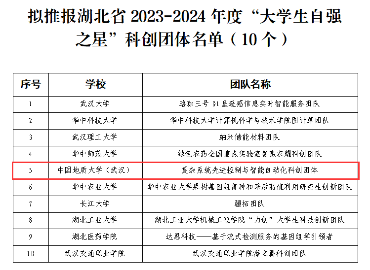 为深入贯彻落实习近平总书记关于青年工作的重要思想,动员引领广大团员青年为强国建设、民族复兴伟业挺膺担当,团省委、省学联组织开展了湖北省“大学生自强之星”推报活动。经高校申报、省级遴选等环节,共评选出湖北省“大学生自强之星”科创团体10个,其中,海角视频 复杂系统先进控制与智能自动化科创团体,荣获湖北省2023-2024年度“大学生自强之星”称号。
